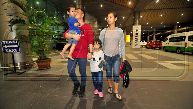 Chong Su Kyun (kiri) bersama isterinya, Catherine Jaikol dan 2 anak mereka, Olivon serta Meilerin (kanan) di Lapangan Terbang Antarabangsa Kota Kinabalu, malam tadi.